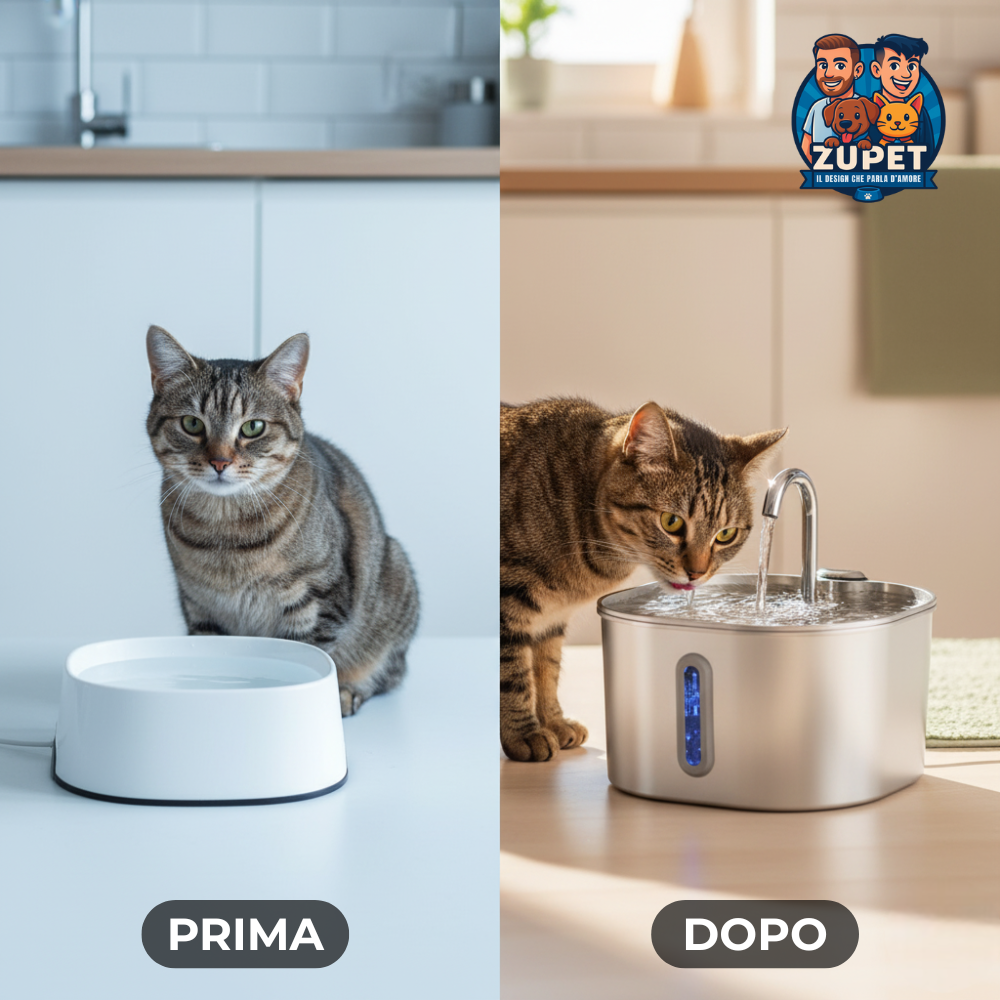 Il movimento continuo dell’acqua stimola l’istinto naturale del gatto a bere di più, fino al 200 % in più rispetto alle ciotole statiche. Più acqua, più salute per reni e vie urinarie.